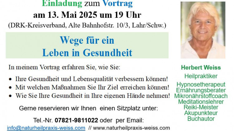 Mit praktischen Tipps und Strategien das eigene Wohlbefinden steigern - für mehr Lebensqualität. Nehmen Sie Ihre Gesundheit in die eigenen Hände. Melden Sie sich jetzt an und starten Sie Ihre Reise zu einem gesünderen Leben! Zu weiteren Informationen ...http://www.naturheilpraxis-weiss.com